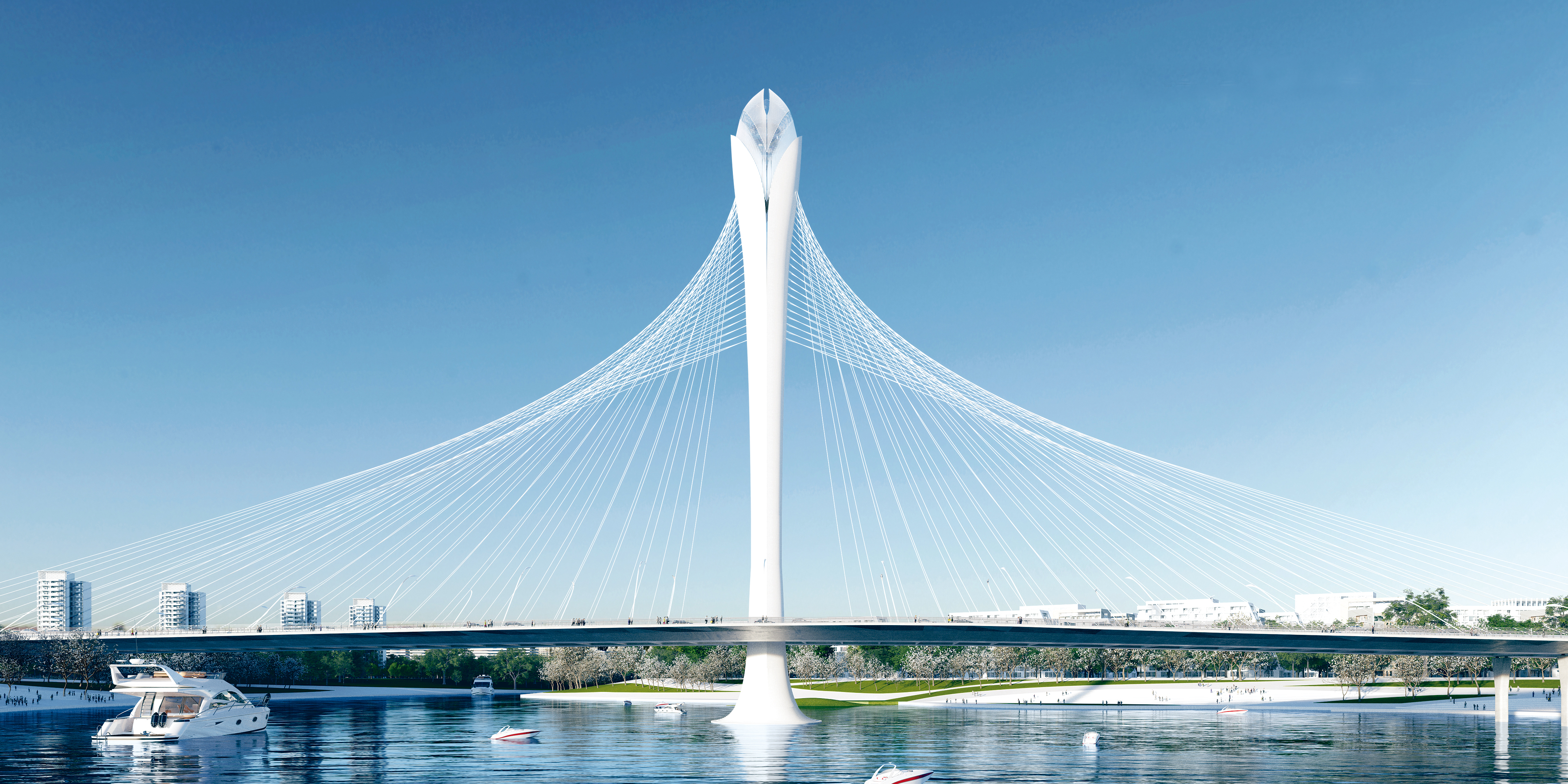 2018年11月,濱海灣新區管委會主持開展“濱海灣大橋方案設計國際競賽”。本方案“絲路明燈、玉蘭花開”脫穎而出,為60+200+200+60m=520m獨塔扭索面斜拉橋。主梁采用分離式鋼箱梁截面,主塔為含苞待放的玉蘭花造型。