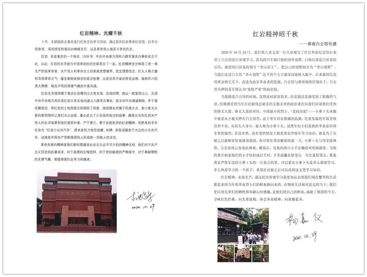 在這次的參觀學習過程中,我們共同緬懷革命先烈,共同回顧他們當年艱苦抗戰(zhàn)的故事,共同見識祖國逐漸強盛的發(fā)展歷程。未來,我們需要不斷傳承紅巖精神,堅守初心使命,為祖國建設奉獻出自己的力量。在本次行程結束后,幾位黨員就此次的參觀學習經歷撰寫了個人心得體會,在此分享: