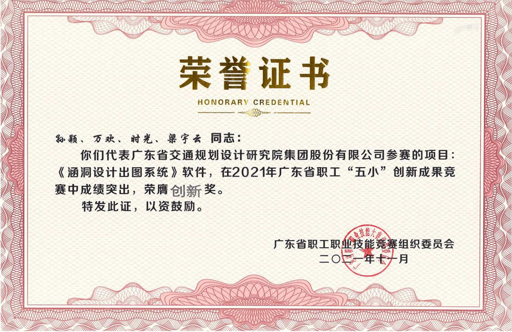 11月23—24日,2021年廣東省職工“五小”創(chuàng)新成果競(jìng)賽決賽暨總結(jié)大會(huì)在廣州舉行。本次競(jìng)賽由廣東省總工會(huì)、廣東省人力資源和社會(huì)保障廳、廣東省工業(yè)和信息化廳、廣東省科學(xué)技術(shù)廳主辦,廣東省總工會(huì)職工技術(shù)協(xié)作中心、廣東省質(zhì)量協(xié)會(huì)、廣州市質(zhì)量協(xié)會(huì)承辦。經(jīng)過(guò)激烈的角逐,公司數(shù)字化技術(shù)研究院研發(fā)的《涵洞設(shè)計(jì)出圖系統(tǒng)》軟件榮獲創(chuàng)新獎(jiǎng)。
