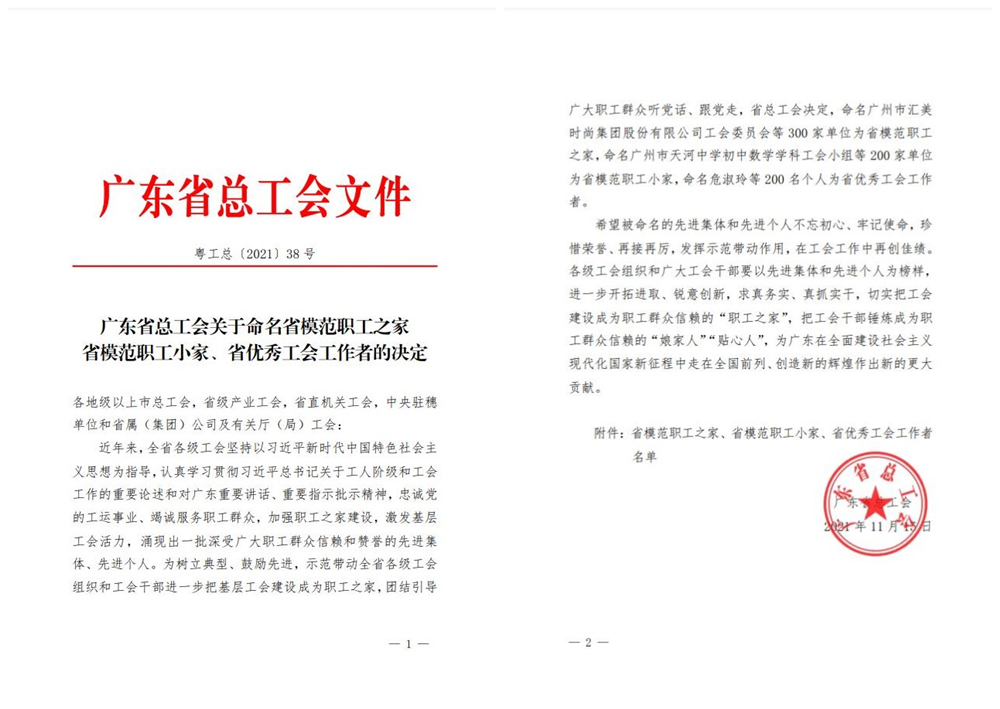 近日,從廣東省總工會傳來喜訊,我公司榮獲“廣東省模范職工之家”稱號。這是集團(tuán)公司首次獲得該項榮譽,是對集團(tuán)公司工會圍繞中心,服務(wù)大局,切實做好職工“娘家人”、“貼心人”的肯定,特此報喜!