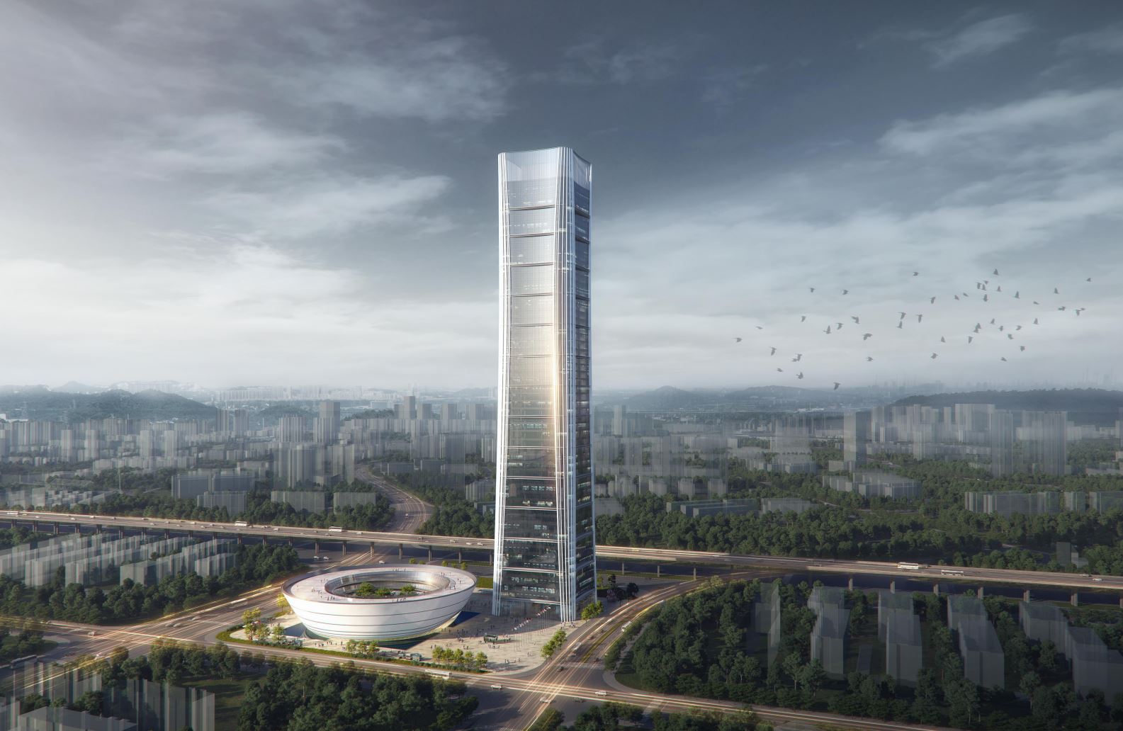 “灣區之源”方案以“天下萬物生于有,有生于無”為設計主題,由塔樓和裙樓兩部分組成,長短相形,高下相傾,前后相隨。塔樓功能以辦公和商住為主,外立面造型靈感來自竹節,象征“生生不息,堅韌不拔”;裙樓平面布置可塑性強,可滿足會議、會展、商演等多功能需求,形似容器,通體渾圓,寓意“包容并蓄,有容乃大”。同時,方案圍繞“綠色、環保”進行了多項創新設計。
