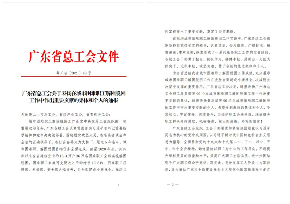12月20日,廣東省總工會以電視電話會議形式召開了全省城市困難職工解困脫困工作總結表彰會。會議總結了五年來全省各級工會推進城市困難職工解困脫困工作取得的重大成就,并表揚了一批在工作中真抓實干、無私奉獻、攻堅克難、勇于創新的先進集體和個人。我公司被省總工會授予“在城市困難職工解困脫困工作中作出重要貢獻集體”榮譽稱號!