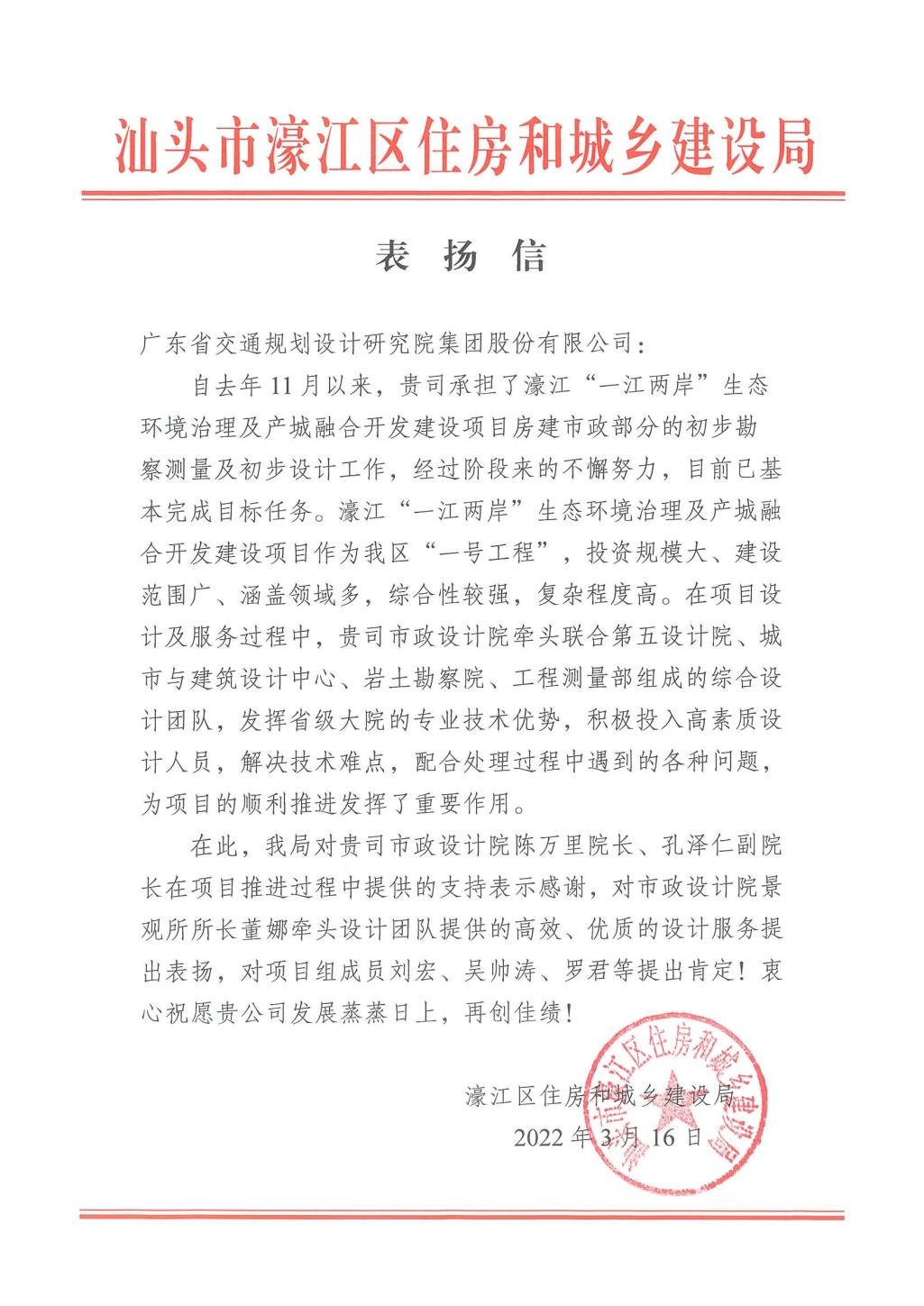 項目中標后,我集團積極投入高素質設計人員解決技術難點,主動承擔項目推進過程中遇到的各種問題,以高標準的設計要求、高效率的設計響應,順利完成了項目的初步設計工作。區委副書記、副區長黃鵬偉在初設匯報會議上,對我集團的工作表示了充分認可,對初設研究深度及設計成果給予了較高的評價。目前,本項目已順利通過初步設計專家評審,初步設計修編成果也已完成提交。業主對我集團給予了書面表揚。