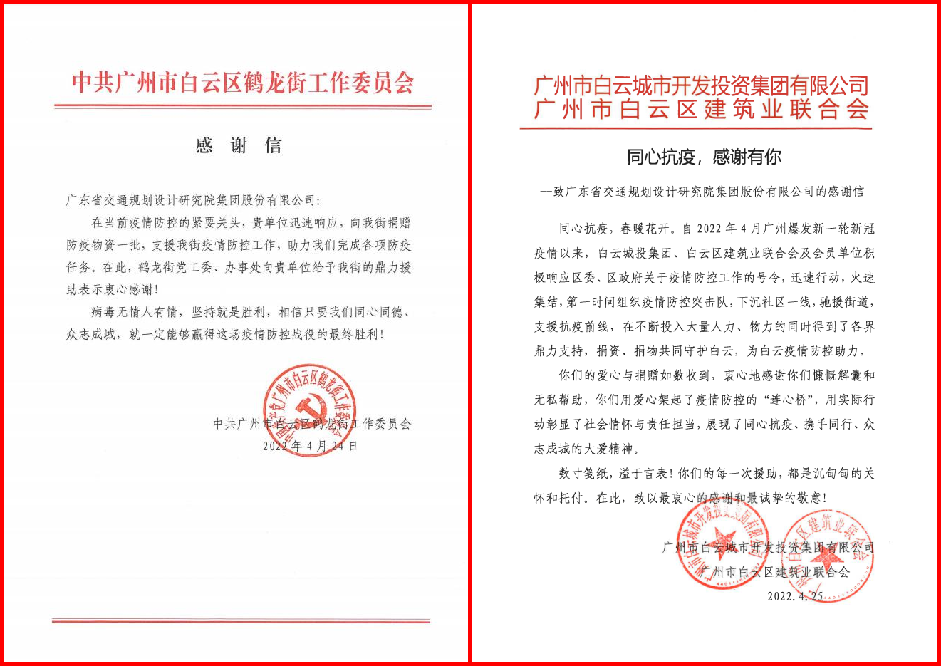 集團收到白云區鶴龍街黨工委、白云城投集團感謝信
