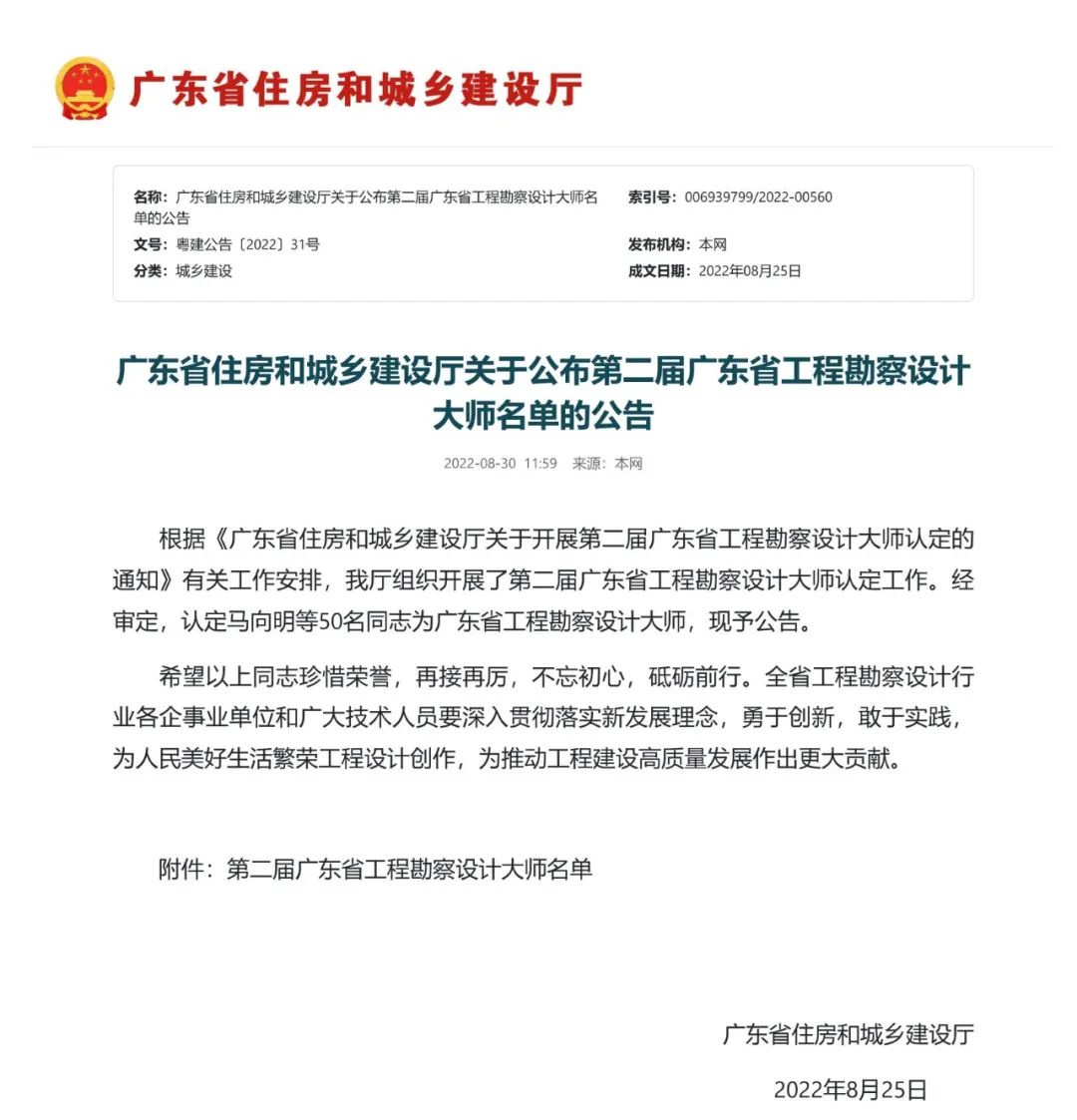 8月30日,廣東省住房和城鄉(xiāng)建設(shè)廳發(fā)布《關(guān)于公布第二屆廣東省工程勘察設(shè)計(jì)大師名單的公告》,集團(tuán)首席專家梁立農(nóng)、集團(tuán)副總工程師劉吉福成功當(dāng)選為廣東省工程勘察設(shè)計(jì)大師!