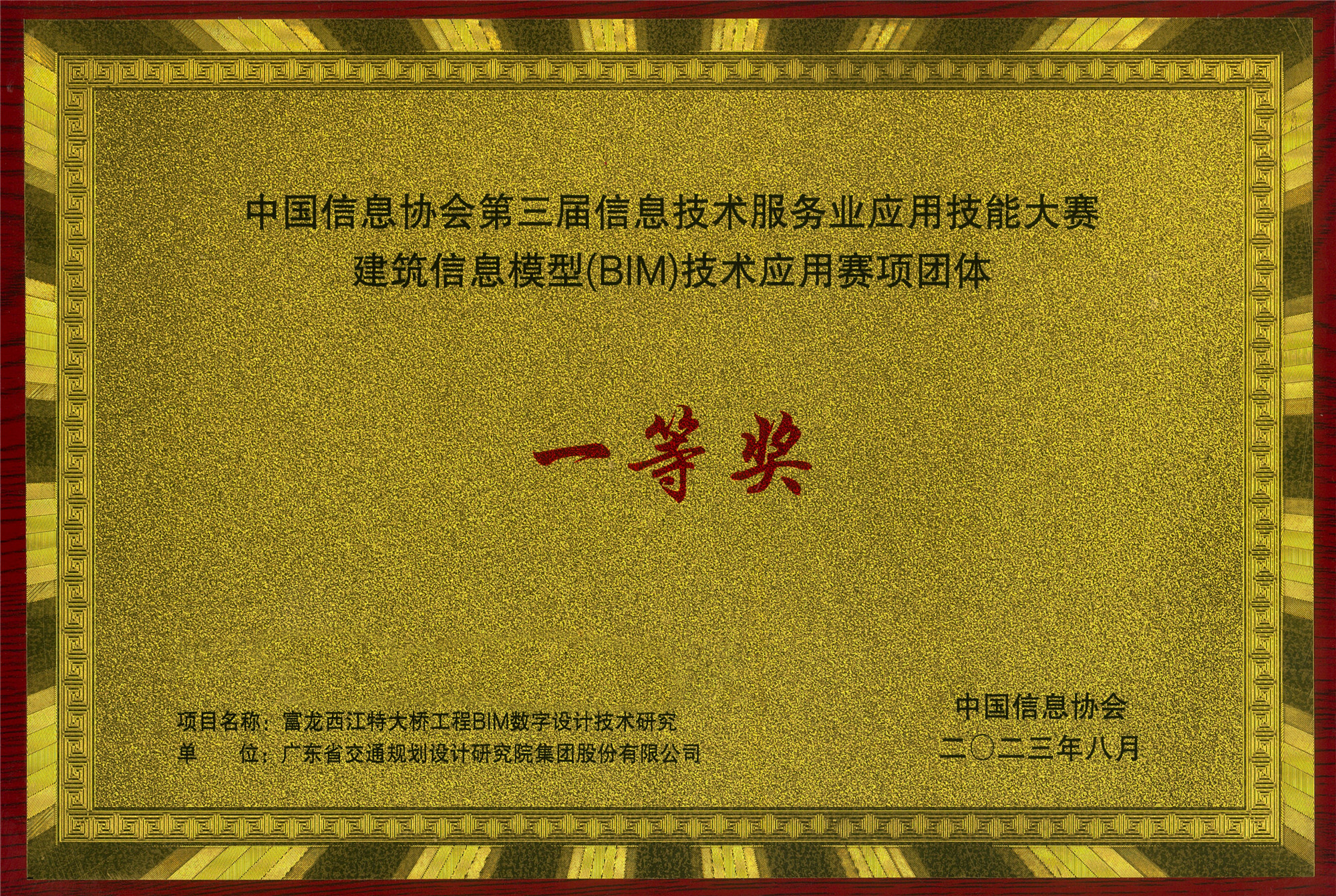 近日,2023年度中國信息協(xié)會第三屆信息技術(shù)服務(wù)業(yè)應(yīng)用技能大賽頒獎(jiǎng)典禮在北京隆重召開。經(jīng)過選拔賽、決賽和專家審議復(fù)查,公司《富龍西江特大橋工程BIM數(shù)字設(shè)計(jì)技術(shù)研究》項(xiàng)目從全國各工程行業(yè)1200余個(gè)BIM參評項(xiàng)目的激烈競爭中脫穎而出,榮獲一等獎(jiǎng)。這是公司首次獲得中國信息協(xié)會BIM賽項(xiàng)一等獎(jiǎng)。