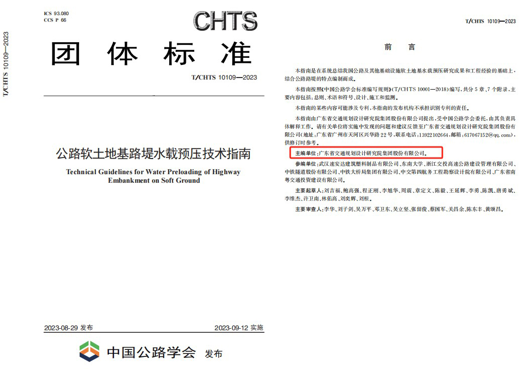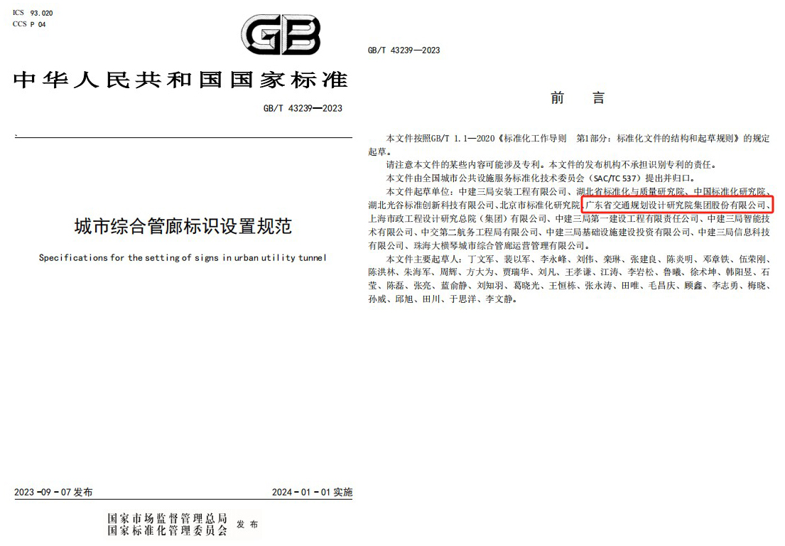 近日,公司參編的國家標準《城市綜合管廊標識設置規范》(GB/T 43239—2023)以及主編的中國公路學會團體標準《公路軟土地基路堤水載預壓技術指南》(T/CHTS10109—2023)兩項標準成果正式發布。