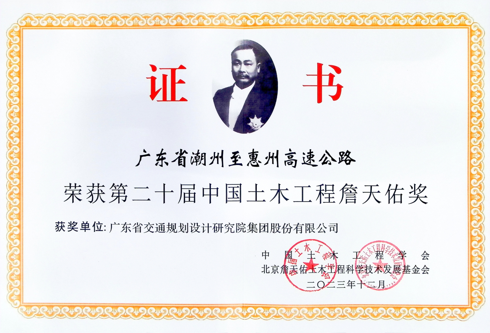 近日,中國土木工程學會2024年學術年會、第二十屆中國土木工程詹天佑獎頒獎大會在蘇州舉行,由公司負責的勘察設計項目-廣東省潮州至惠州高速公路(以下簡稱“潮惠高速公路”)榮獲“第二十屆中國土木工程詹天佑獎”。