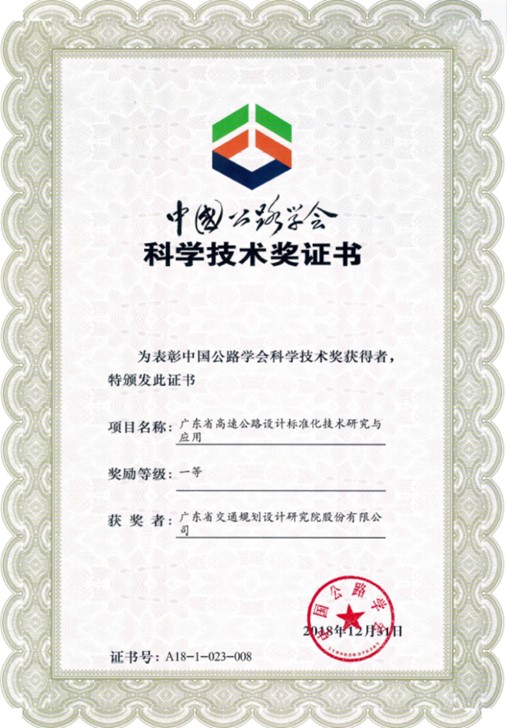 公司在國內率先系統完整開展全國最大規模的高速公路設計標準化研究,構建涵蓋高速公路各專業的設計標準化體系,研究成果被廣東省交通運輸廳發布實施,目前已應用于省內6000km以上高速公路項目,填補了全國系統開展公路設計標準化研究的空白,對全國公路行業設計標準化發展起到了一定的引領作用,為公路行業工業化建造轉型升級奠定了基礎。榮獲中國公路學會科學技術一等獎。