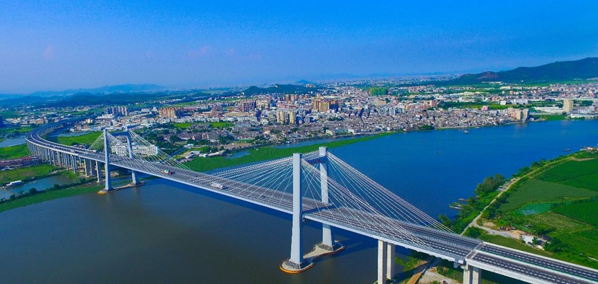 為有效解決海運對橋梁下部凈空要求和飛機航線對橋塔凈高限制的矛盾,首創大跨徑混合梁柔梁密索矮塔斜拉橋體系,主橋跨徑布置為60m+70m+380m+70m+60m=640m;首創全焊整體式鋼錨箱索塔錨固技術;首次研發縱橫向正交分離減隔震技術和鋼阻尼滑板支座、可調高隔震支座。榮獲廣東省土木建筑學會科學技術一等獎、中國公路學會科學技術二等獎。