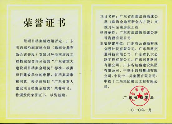 日前,由我司作為主要參建單位之一的廣東省西部沿海高速公路(珠海金鼎至新會古井段)支線月環至南屏段工程項目檔案榮獲2009年“廣東省重大建設項目檔案金冊獎”。
