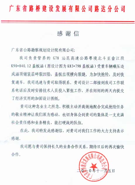 近日,公司收到一封來自業主單位省路橋建設發展有限公司路達分公司的《感謝信》,來信對于我司的高效服務給予了高度贊揚。