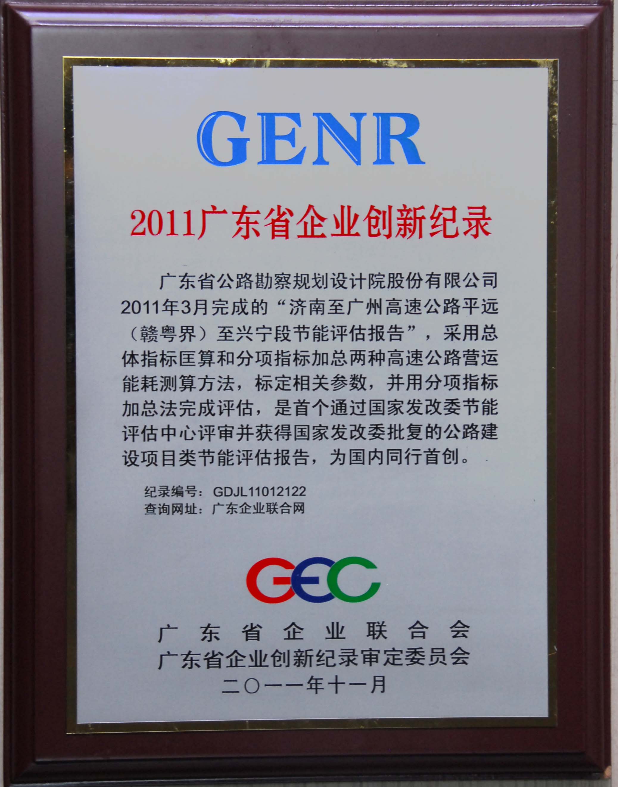 日前,公司編制的“濟(jì)南至廣州高速公路平遠(yuǎn)(贛粵界)至興寧段節(jié)能評估報(bào)告”順利通過廣東省企業(yè)創(chuàng)新紀(jì)錄組委會和廣東省企業(yè)創(chuàng)新紀(jì)錄審定委員會審核,入選2011年廣東省企業(yè)創(chuàng)新紀(jì)錄(紀(jì)錄號GDJL11012122)。本次評選活動由廣東省企業(yè)聯(lián)合會和廣東省企業(yè)家協(xié)會聯(lián)合主辦。