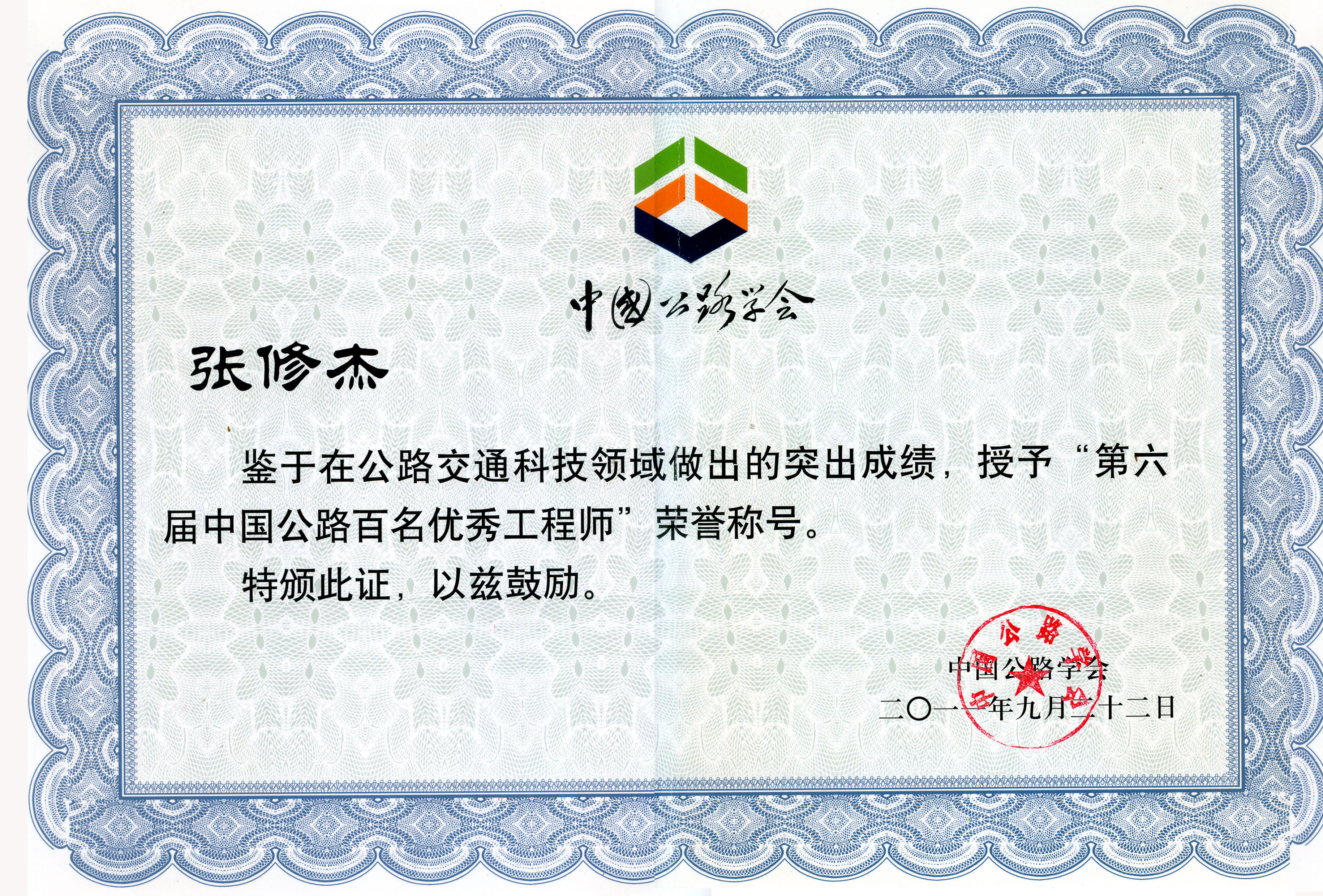 經中國公路學會評審,我公司張修杰副總工程師被授予“第六屆中國公路百名優秀工程師”榮譽稱號,特此報喜。