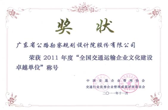 熱烈祝賀公司榮獲“2011年全國交通運輸企業文化建設卓越單位”