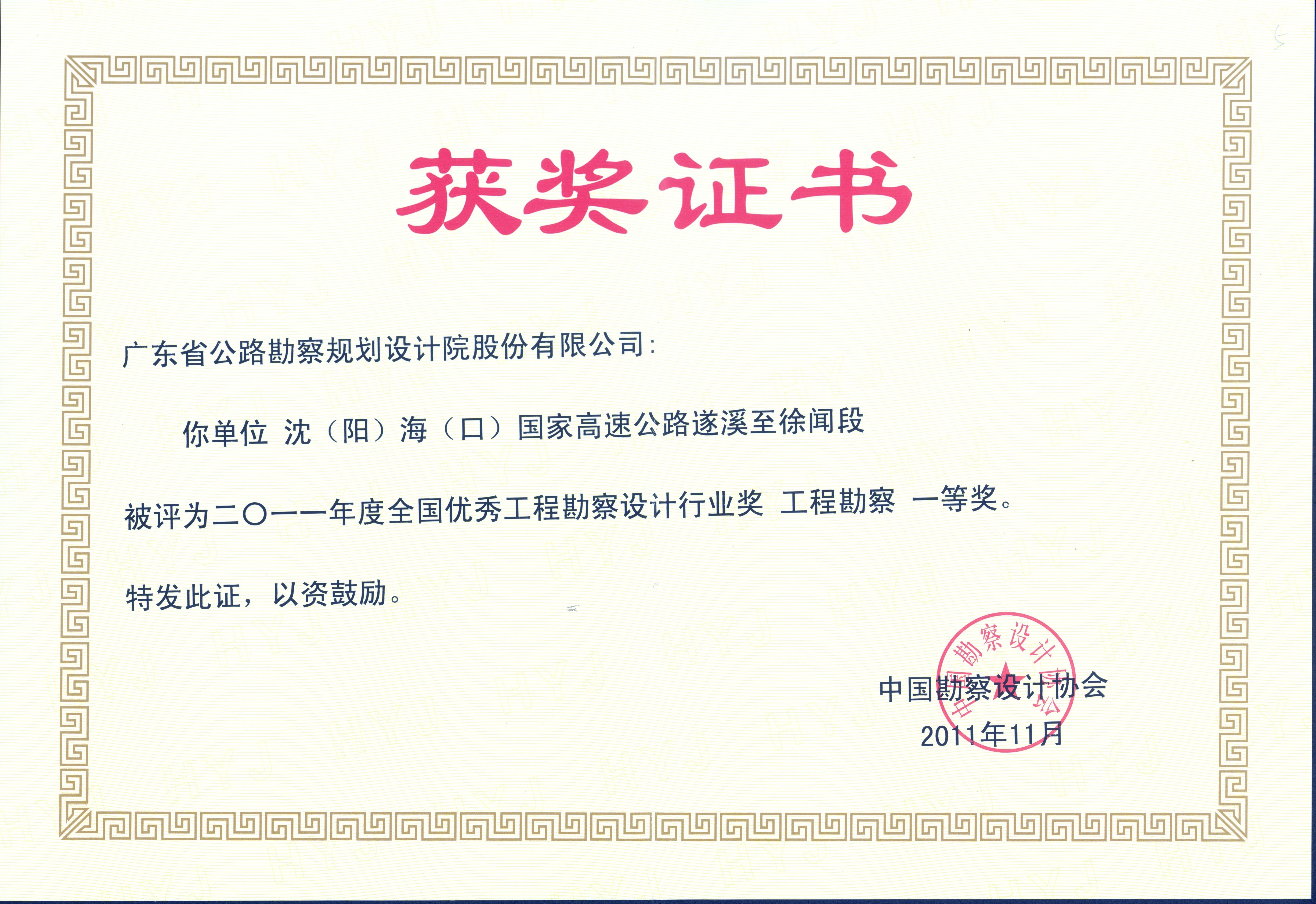 公司完成的四個項目分別榮獲“2011年度全國優秀工程勘察設計行業獎 工程勘察一、二、三等獎”