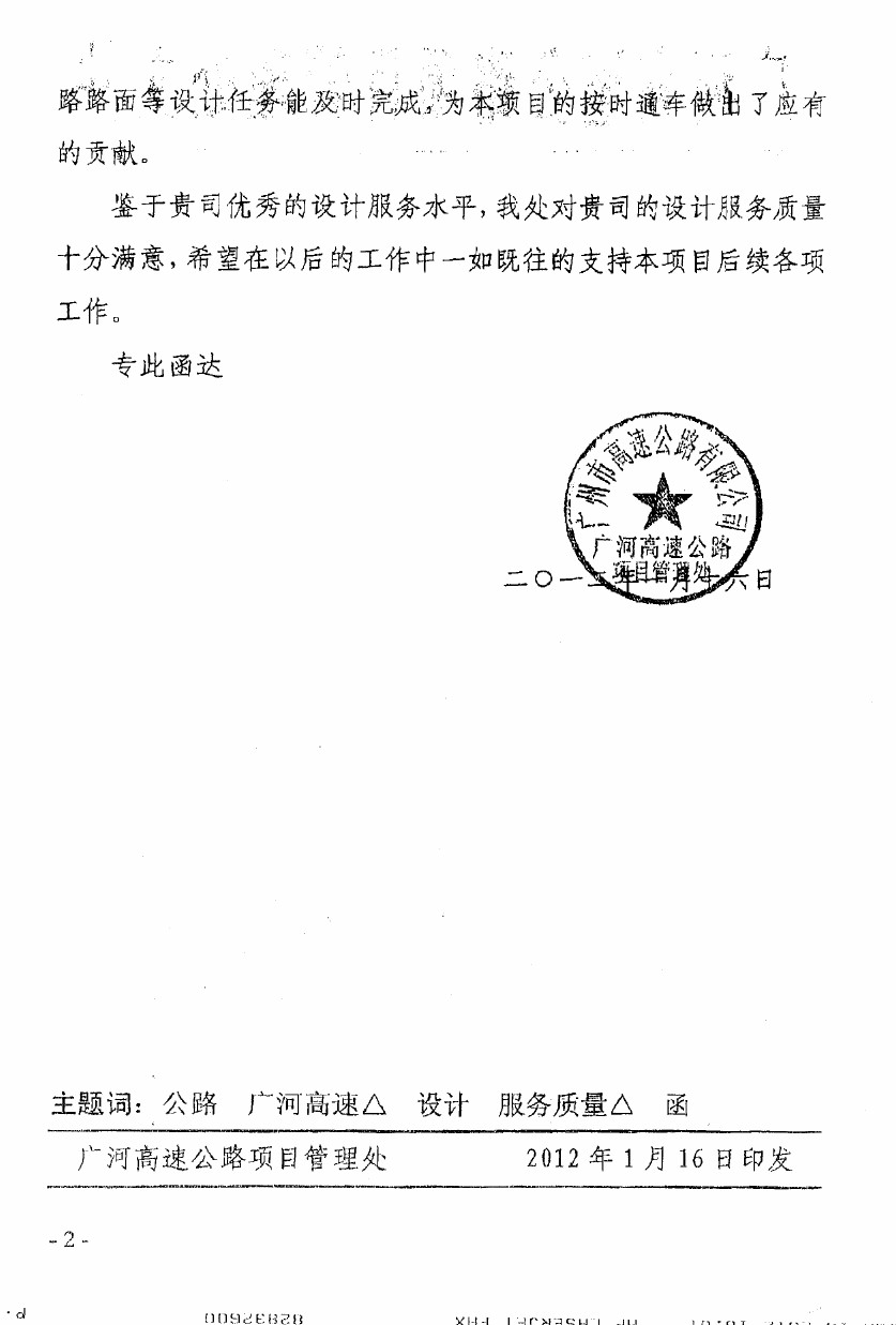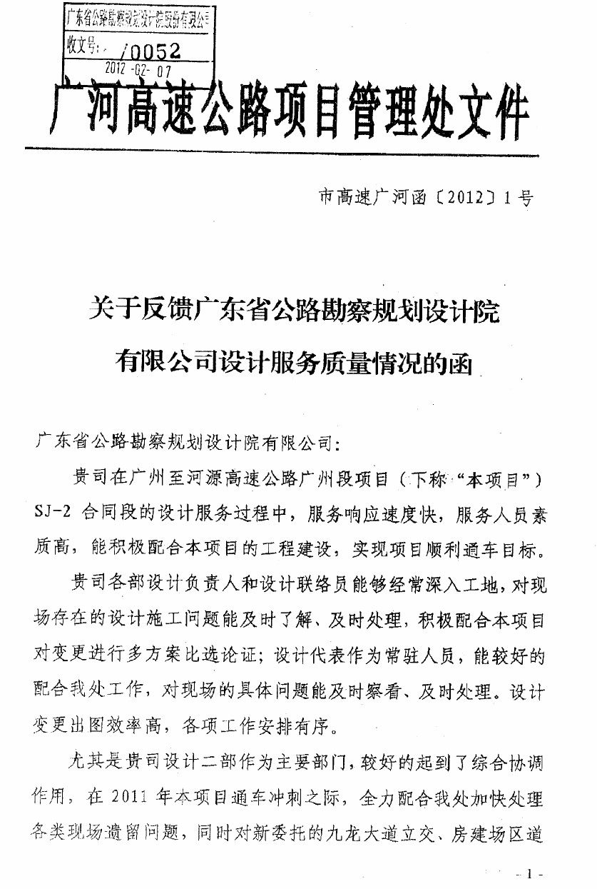近日,業主單位廣河高速公路項目管理處專函盛贊公司設計后服務工作,并對以第二路橋設計部為主的服務團隊在廣州至河源高速公路廣州段設計后服務中的優異表現給予了充分肯定和高度贊揚,認為我司設計服務水平“優秀”,對我司的服務質量表示“十分滿意”。