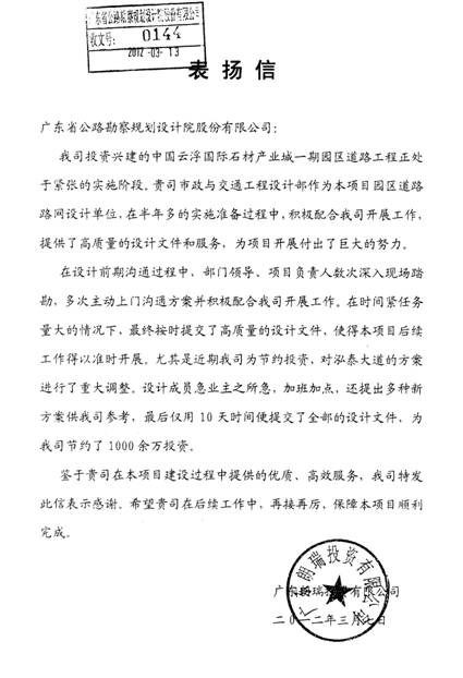 近日,廣東朗瑞投資有限公司向公司發來表揚信,對市政與交通工程部在云浮國際石材產業城一期園區道路路網項目中提供的“高效、優質”的設計文件和服務給予了充分肯定和高度贊揚。特表祝賀!