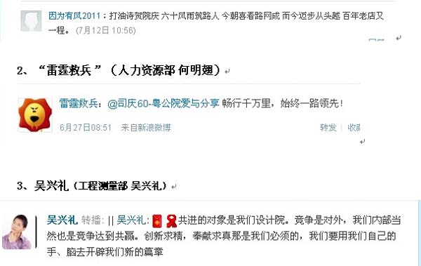 近日,公司“司慶微(博)祝福互動”活動獲獎名單揭曉,“釣到一條幸福魚”等12名員工網友榮獲“捷足先登獎”、“最受關注人氣獎”和“最佳原創獎”等三個獎項。本次活動得到了廣大員工網友的熱情參與。經過認真甄選,“因為有風2011”、“雷霆救兵”和吳興禮等3名網友的祝福語在眾多的祝福語中脫穎而出,榮獲“最佳原創獎”。