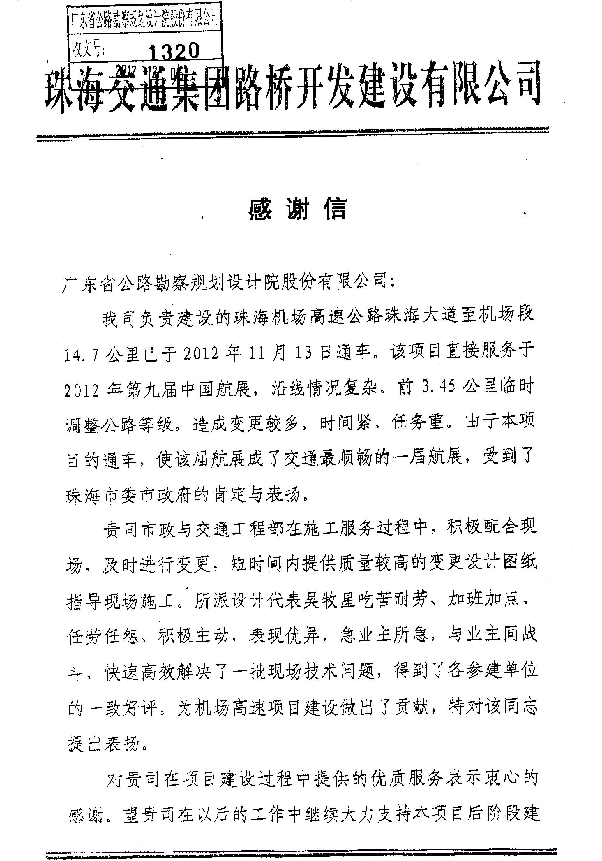 近日,珠海交通集團有限公司珠海機場高速公路項目管理部發來感謝信,對公司市政與交通工程部團隊在珠海機場高速珠海大道至機場段項目中提供的“優質服務”表示滿意和感謝。目前該項目已經完工通車,為第九屆中國航展提供了順暢的交通服務。