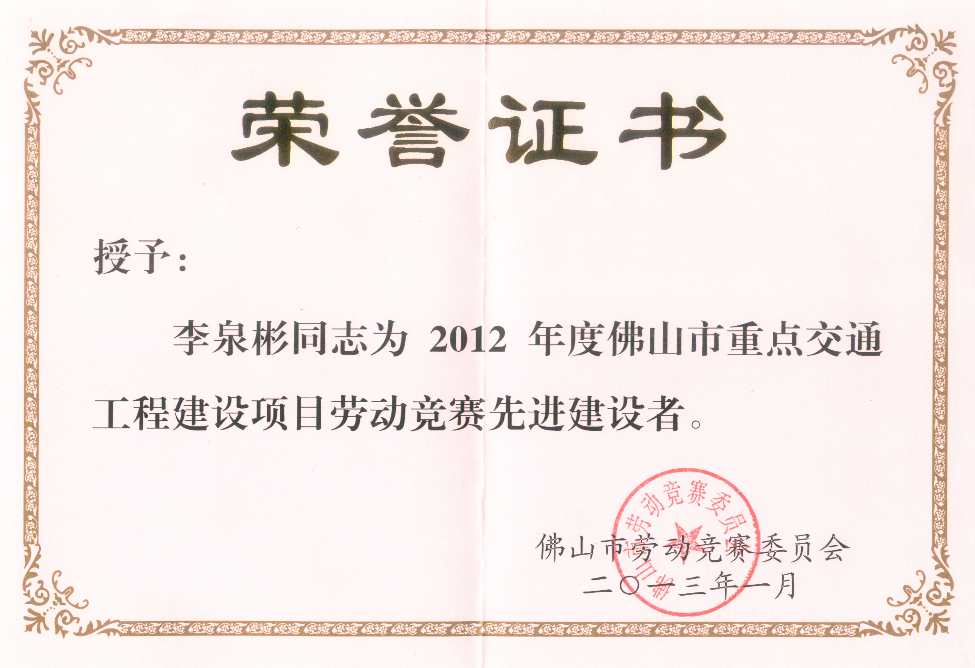 近日,我司第三路橋分公司駐廣明高速公路陳村至西樵段設計代表李泉彬同志受到佛山市總工會和佛山市路橋建設有限公司聯合表彰,榮獲2012年度“佛山市重點交通工程建設項目勞動競賽先進建設者”稱號,為公司樹立了良好的外部形象,贏得了聲譽,特表祝賀!