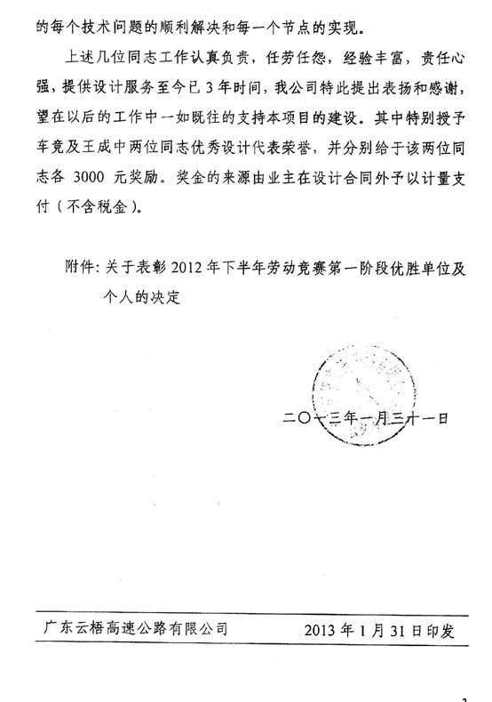 近日,廣東云梧高速公路有限公司發來表彰決定,高度肯定我司的設計服務質量,并對第二路橋分公司設計代表車競、吳玲正、龐立果、和立公司王成中和隧道部王超等人在云浮至岑溪高速公路雙鳳至榃濱段高速公路項目的設計后服務表示滿意和感謝。其中,車競和王成中被評為“優秀設計代表”,特表祝賀。