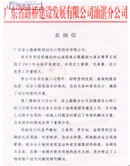 近日,省路橋建設發展有限公司汕湛分公司發來表揚信,對我司在汕湛高速公路揭西大溪至博羅石壩段項目中提供的優質、高效的設計后服務表示高度贊揚,對負責該項目的第三路橋設計分公司、巖土勘察分公司及隧道設計部,和尹健標、王春明等一批設計代表的工作表示感謝。特此報喜。