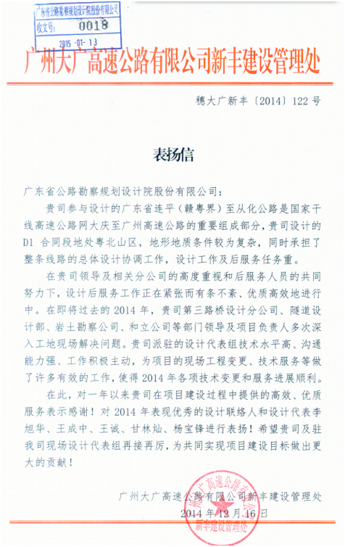 近日,廣州大廣高速公路有限公司新豐建設管理處發來表揚信,對我司在大廣高速連平至從化段項目中提供的高效、優質服務表示贊揚,同時對負責該項目的第三路橋設計分公司等組織和個人給予了通報表揚。特此報喜。