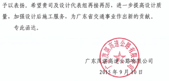 茂湛高速公路項(xiàng)目設(shè)計(jì)后服務(wù)受業(yè)主表彰