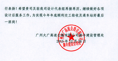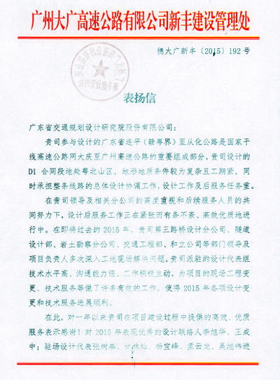 近日,廣州大廣高速公路有限公司新豐建設管理處發來表揚信,對我司在大廣高速粵境段連平至從化公路項目中提供的高效、優質的設計后服務表示贊揚,同時對負責該項目的第三路橋設計分公司、隧道設計部、巖土勘察分公司、交通工程部、和立公司,設計聯絡人李旭華、王成中及設計代表張樹春、甘林燦、楊寶峰、孟云龍、吳旭偉等組織及個人給予了肯定和表揚,特此報喜。目前,大廣高速粵境段已于2015年12月31日正式通車。