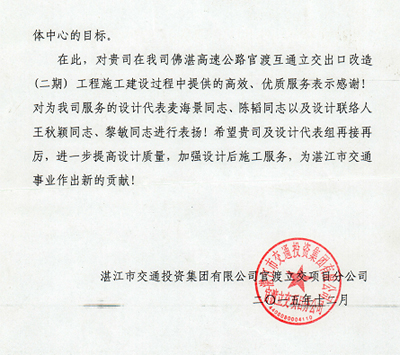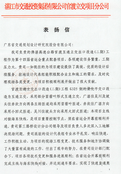 近日,湛江市交通投資集團有限公司官渡立交項目分公司發來表揚信,對我司在佛湛高速公路官渡互通立交出口改造(二期)工程項目中提供的高效、優質的設計后服務表示贊揚,同進對負責該項目的第三路橋設計分公司設計代表麥海景同志、陳韜同志以及設計聯絡人王秋穎同志、黎敏同志給予了肯定和表揚,特此報喜。