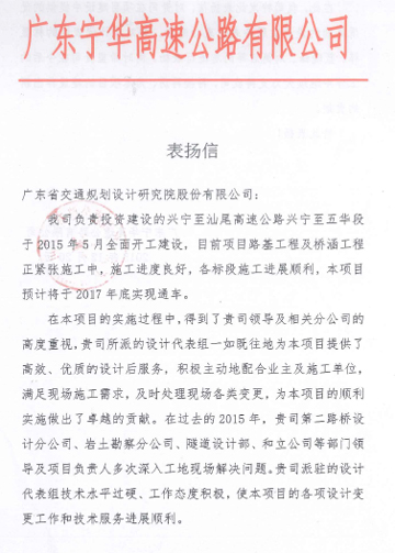 寧華高速公路項(xiàng)目設(shè)計(jì)后服務(wù)受業(yè)主單位表彰