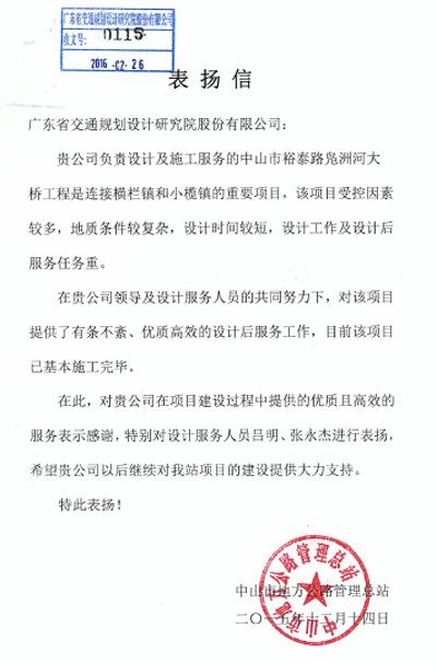 近日,中山市地方公路管理總站發來表揚信,對我司在中山市裕泰路鳧洲河大橋工程中提供的高效、優質的設計后服務表示贊揚,同時該項目所屬的第一路橋設計分公司及設計代表呂明、張永杰等個人給予了通報表揚。特此報喜。