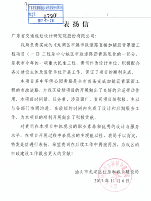 近日,汕頭市龍湖區(qū)住房和城鄉(xiāng)建設(shè)局發(fā)來表揚(yáng)信,對(duì)我司在龍湖區(qū)市屬市政道路直接加鋪瀝青罩面工程項(xiàng)目(一)中提供的優(yōu)質(zhì)、高效的設(shè)計(jì)及后服務(wù)表示感謝,對(duì)負(fù)責(zé)此次項(xiàng)目的市政設(shè)計(jì)分公司及項(xiàng)目團(tuán)隊(duì)給予了充分肯定,特此報(bào)喜!
