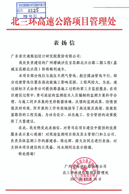 近日,北三環高速公路項目管理處發來表揚信,對我司在廣州增城沙莊至花都北興公路二期工程(荔城至花都北興段)項目中提供優質服務表示肯定,對負責該項目的和立公司及其相關負責人江茂盛、劉永翔,技術人員廖建春、陳運輝、游文法給予了通報表揚,特此報喜!