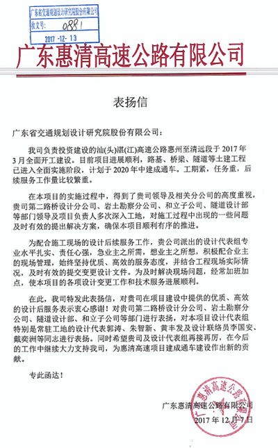 近日,廣東惠清高速公路有限公司發來表揚信,對我司在汕湛高速公路惠州至清遠段工程項目中提供的優質、高效的設計后服務表示肯定和感謝,對負責該項目的第二路橋設計分公司、巖土勘察分公司、和立公司、隧道設計部等部門給予了充分的肯定,對駐地設計代表郭濤、朱智新、黃豐發等給予了通報表揚,特此報喜!