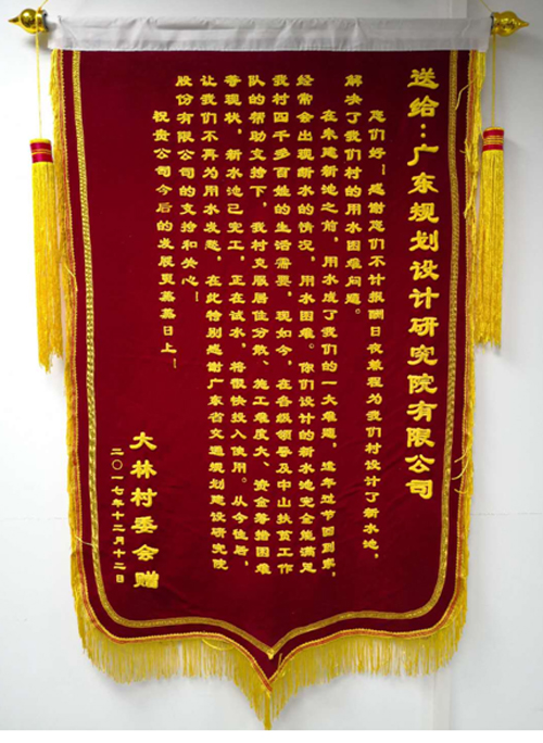 2018年新年伊始,肇慶市封開縣金裝鎮(zhèn)大林村委會(huì)送來了一面錦旗,對(duì)我公司市政分公司優(yōu)質(zhì)高效的完成大林村新水池的設(shè)計(jì)任務(wù),為當(dāng)?shù)厮那Ф嗝习傩战鉀Q了用水難的問題表示由衷的感謝。