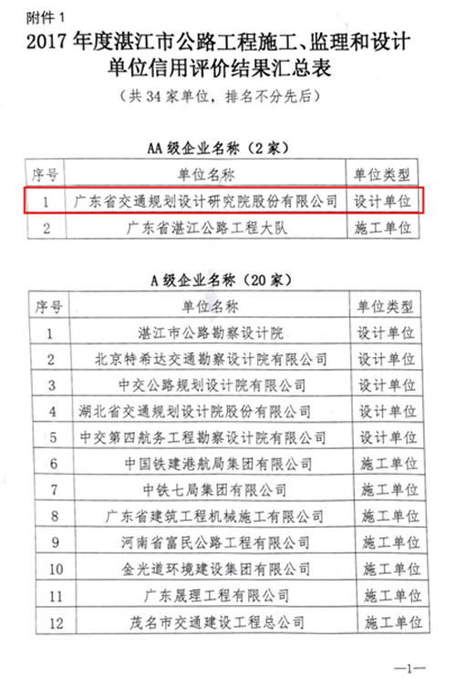 近日,湛江市交通運輸局公布了2017年度湛江市公路水運工程從業單位信用評價結果。我公司是唯一一家榮獲2017年度湛江市公路工程施工、監理和設計單位信用評價AA級企業認證的設計單位。