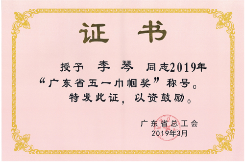 近日,從廣東省總工會傳來喜訊,我公司黨委副書記、副總經(jīng)理、工會主席、女職工委主任李琴女士喜獲“廣東省五一巾幗獎”榮譽稱號,特此報喜。