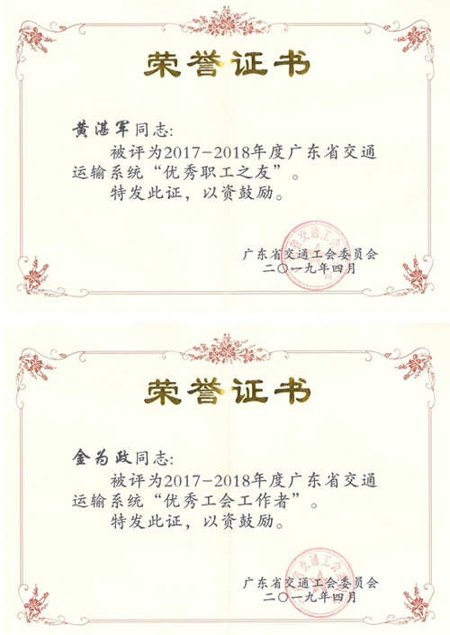 近日,我公司被廣東省交通工會評為2017-2018年度廣東省交通運輸系統“先進女職工集體”;此外,我公司黃湛軍總經理獲評為2017-2018年度廣東省交通運輸系統“優秀職工之友”,金為政同志獲評為“優秀工會工作者”,羅君同志獲評為“優秀女職工”。