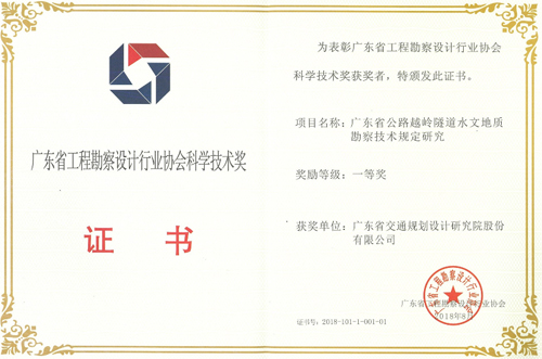 《廣東省公路越嶺隧道水文地質(zhì)勘察技術(shù)規(guī)定研究》榮獲一等獎,獲獎人員:李水清、李紅中、張修杰、王軍、王強、鄧超文、李樹茂、張金平、林少忠、劉祥興;