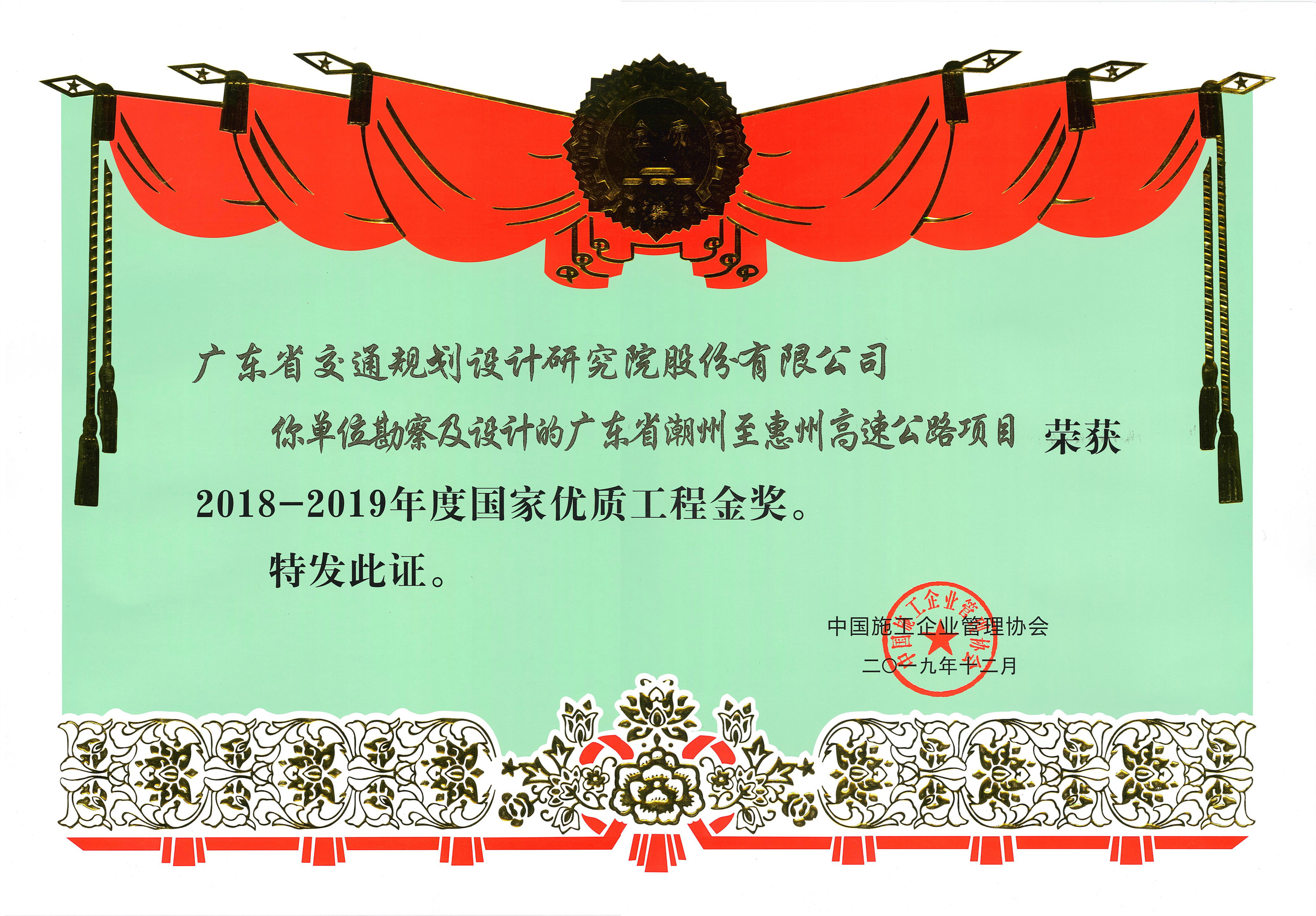 近日,由我公司負(fù)責(zé)勘察設(shè)計(jì)的廣東省潮州至惠州高速公路項(xiàng)目榮獲“2018—2019年度國家優(yōu)質(zhì)工程金獎(jiǎng)”。