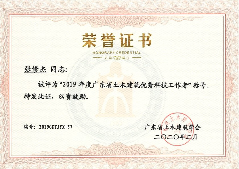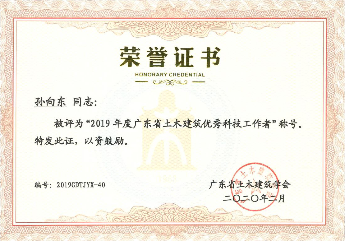 近日,我公司副總工程師孫向東、張修杰同志榮獲“2019年度廣東省土木建筑優(yōu)秀科技工作者”榮譽(yù)稱號(hào)。這是繼梁立農(nóng)總工程師、彭向榮首席副總工程師之后,我公司再次獲得該榮譽(yù)稱號(hào)的兩位技術(shù)專家。