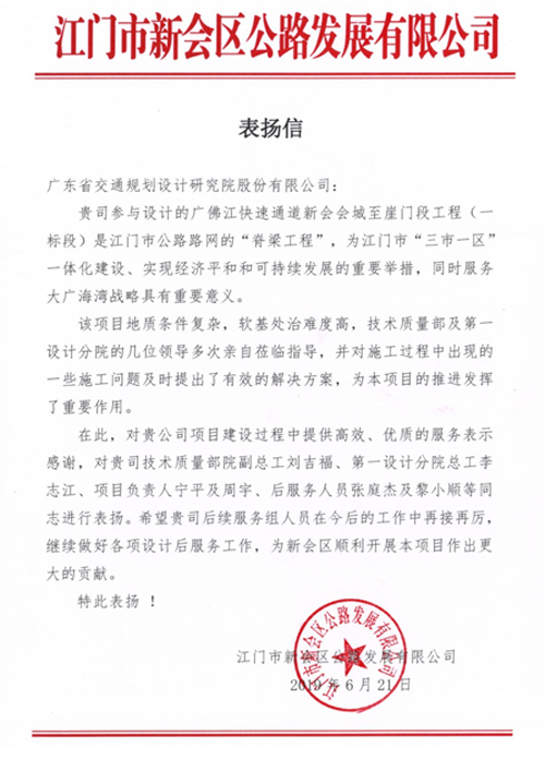 江門市新會區公路發展有限公司對我司在廣佛江快速通道新會會城至崖門段工程(一標段)項目建設過程中提供的高效、優質服務表示了感謝,對參與該項目的技術質量部院副總工劉吉福、第一設計分院總工李志江、項目負責人寧平及周宇、設計后服務人員張庭杰及黎小順等同志給予了通報表揚。