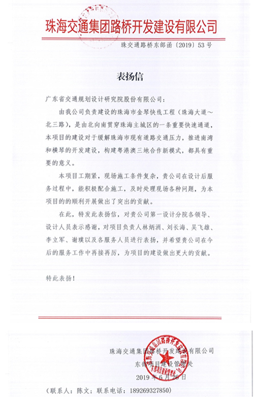 珠海交通集團路橋開發建設有限公司對我司在珠海市金琴快線工程(珠海大道~北三路)項目設計后服務過程中做出的突出貢獻表示了肯定,肯定我司員工良好的職業素養與優秀的技術服務水平,對該項目的負責人林炳洲、劉長海、吳飛雄、李立軍、謝璞以及各服務人員進行了表揚。